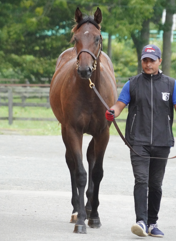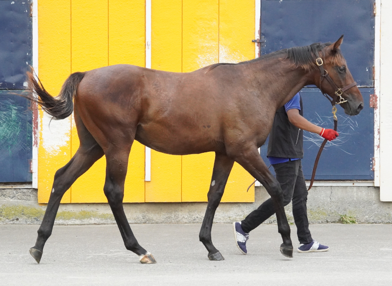 母はハーツクライ産駒らしく胴が長く、性格はおっとり。産駒も似たタイプが多いです。父の産駒は薄手のタイプが多い印象で、お互いを補完するのではないかと考えて配合しました。思い描いた通り、母の馬格のあるところを受け継ぎ、バランス良く出ました。骨量も豊富でしっかりしています。性格は父方を受け継いだようで、放牧地では積極的に他馬に向かっていっています。競走馬として必要なものを備えている印象です。コンスタントに走り、楽しませてくれると思います。