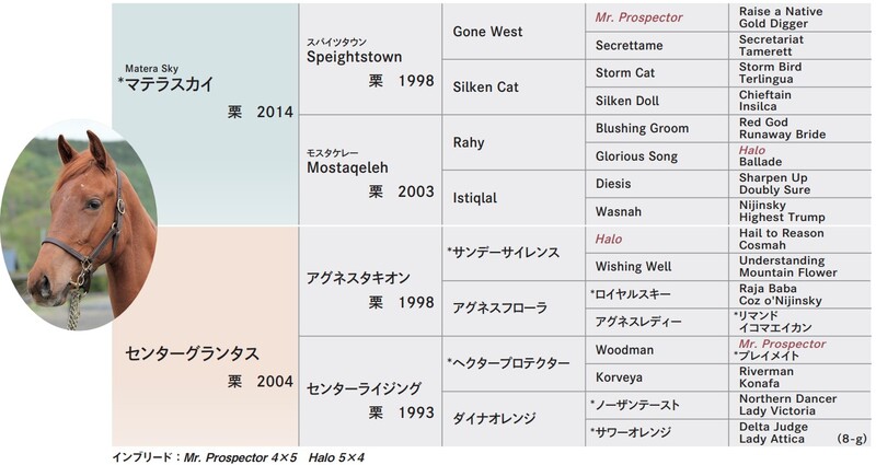 破壊力のある末脚で、キーンランドCと京阪杯を制覇。短距離重賞路線を賑わせたエイティーンガールの妹です。祖母センターライジングは4歳牝馬特別を優勝。遡れば春秋マイルGⅠ制覇を果たしたエアジハードも同じファミリーになります。父マテラスカイはプロキオンSなどダート重賞を2勝。軽快な先行力を武器に2歳から7歳まで全36戦したタフネスでした。また、海外にも積極的に遠征し、ドバイゴールデンシャヒーンでは2着と好走しています。本馬はやや線は細めですが、ラインのきれいな馬体をしています。スラッと脚が長く、背中は短め。捌きの軽さからも芝向きの印象。このあたりは母系の影響が出ているのかもしれません。総じてスピードタイプと考えて良いでしょう。将来はスプリンターとして姉を超えるような活躍を期待しています。