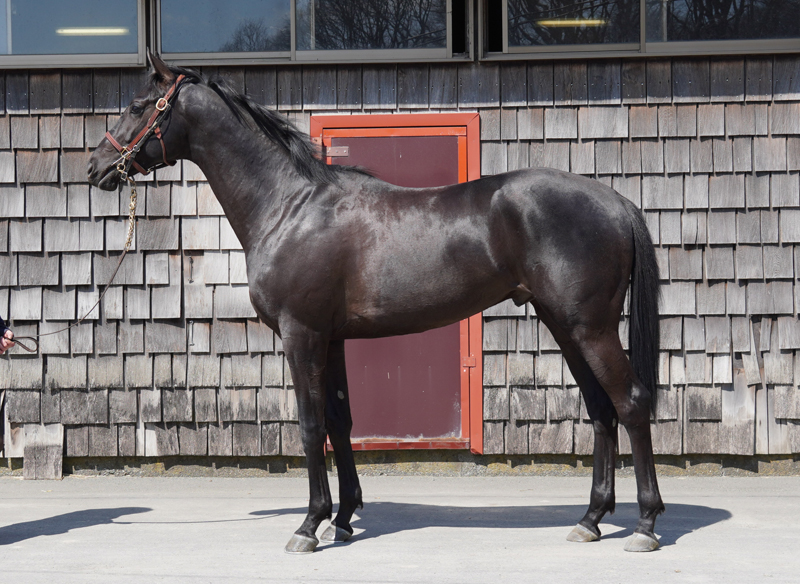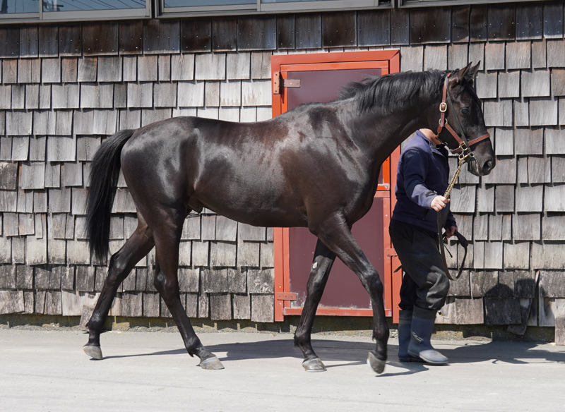 馴致はとてもスムーズで、扱いに困るようなことはありませんでした。また、乗り馴らしの際は、複数頭で乗っても周囲を気にする様子はなく、どっしりと構えていました。現在は、屋根付きのダートコースでダクを1000m、ハッキングを1800m乗っています。落ち着いて運動している一方で、まだ騎乗者に促されながら走っているため、自ら前向きに動こうとする気持ちを引き出していきたいところです。現在の馬体重は446kg。