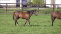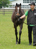 移動後数日間はウォーキングマシーン運動で調整。体調等に問題がなかったことから馴致を開始しています。賢い馬で教えたことをすぐに吸収。至ってスムーズに終了しました。先週の月曜日からはロンギ場で常歩やダクを始め、今週からは年長馬と一緒にフラットワークを行っています。最初は周りを気にしてキョロキョロしていましたが、程なく慣れてくれた様子。最後の方では大人しく運動することができていました。しばらくはじっくりと乗り込んで、口向きをつくりながら基礎体力の強化を図っていく予定です。なお、中間には藤野健太調教師が来場。「バランスが良くて走りそうな雰囲気がある」とコメントされていました。馬体重は395㎏。「馴致はなんの問題もなく終わりました。基本的に賢くて手が掛からない馬ですよ。動きも柔らかいし、良い感じですね。コロンとしているので数字ほど細くは見えませんが、先々のことを考えてもできるだけ増やしておきたいですね。まだこの時期なので、無理せずじっくり進めていきます」(担当者)