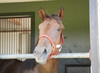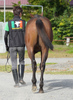 BTCのウッドチップの屋内坂路をハロン18秒くらいまでペースを上げて乗ってきたところ、両前肢の球節に腫れと熱が生じました。そのため、エコー検査とレントゲン検査を行った結果、獣医師から「右前肢は外側、左前肢は内側に種子骨炎と繋靭帯炎を併発しており、右前に比べると左前の症状が進行しています」との所見を得ました。なお、今後の治療方針を相談し、トリミング手術(従来の保存療法とは別に、近年行われるようになった繋靭帯の損傷した組織を取り除く外科的処置)を行うことも検討しましたが、種子骨の化骨を待ってから手術を行った方が望ましいとの判断に至り、当面は保存療法で様子を見ることになりました。現在は本場に移動し、舎飼いしています。概ね3か月は乗り運動を控え、ショックウェーブ治療等を併用しながら回復を促していきます。