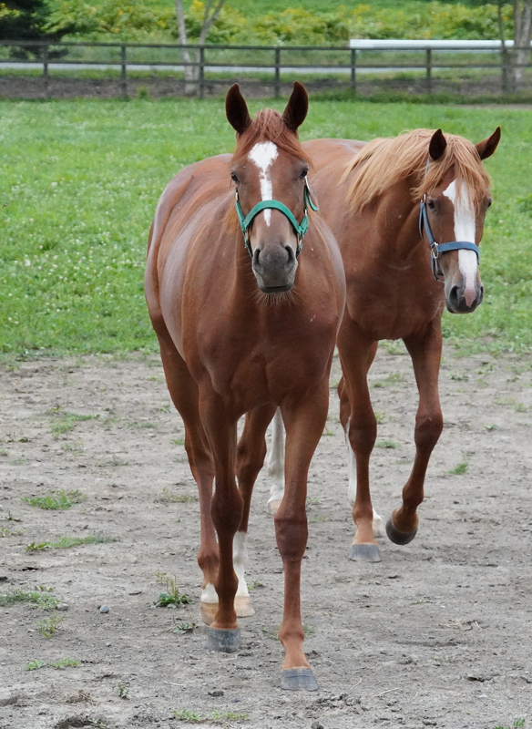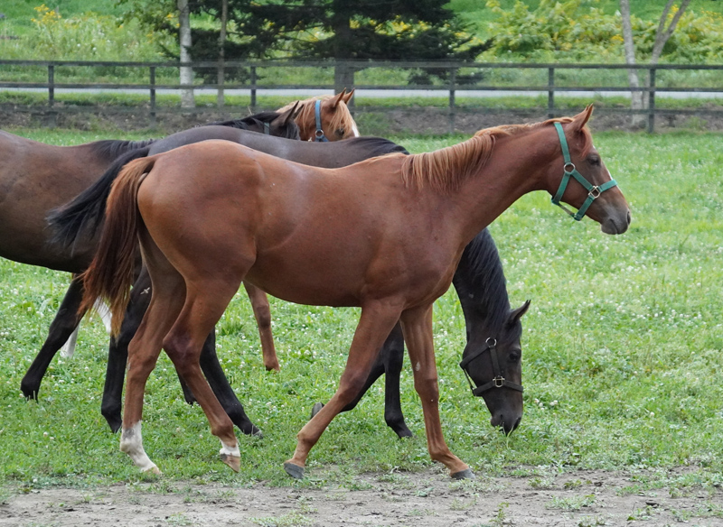 引き続き、昼夜放牧を行い、馬体の成長を促しています。背丈と胴が伸び、胸前や肩、トモの筋肉が盛り上がってきました。春先はコンパクトに見えていましたが、大分印象が変わってきました。また、精神面の成長も見られ、落ち着きが出てきたのは好材料です。心身ともに成長した姿を見ると、厳しい夏を無事に過ごせたことがよくわかります。もうしばらくは昼夜放牧を継続し、より成長を促した上で馴致を開始する予定です。現在の馬体重は413kg。