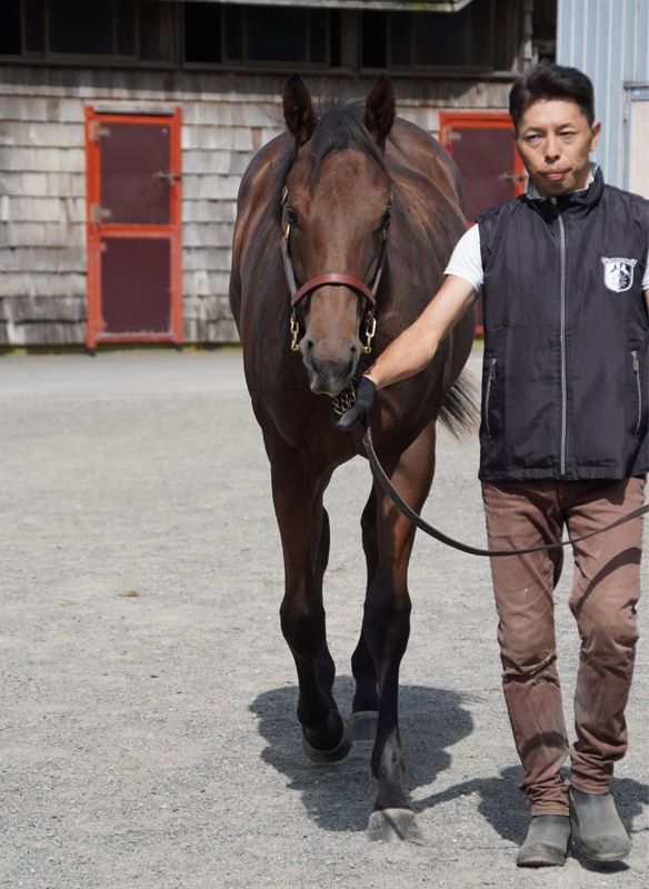 移動後の環境の変化に適応するのに、時間を要することはありませんでした。馴致を行っても同様で、すぐに騎乗へと移行できました。現在は、屋根付きのロンギ場等で乗り馴らしを行っています。一頭になっても寂しがるようなことはありませんし、騎乗者からの指示に対しても素直に反応しています。このまま口向きをしっかりつくった上で、屋根付きのダートコースでの乗り運動を始めていく予定です。現在の馬体重は430kg。