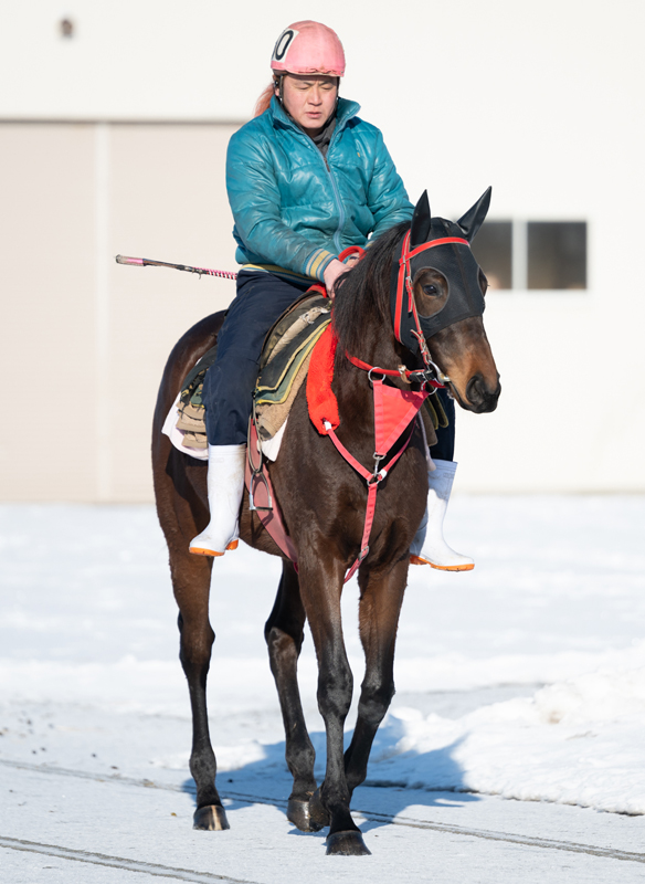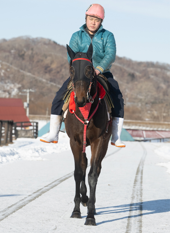 現在は、屋根付きのダートコースでダクを1000m、ハロン25秒を上限とするキャンターを2000m乗っています。走ることに対して非常に真面目で、ひたむきな姿は好感が持てます。左回りに比べてスムーズさに欠けていた右回りでは、効率の良い走りを掴みつつあり、脚捌きがスムーズになってきました。距離を延ばしてもバテずに走れており、基礎体力は着実に強化されています。このまま下地の強化に力を入れていきます。現在の馬体重は450kg。