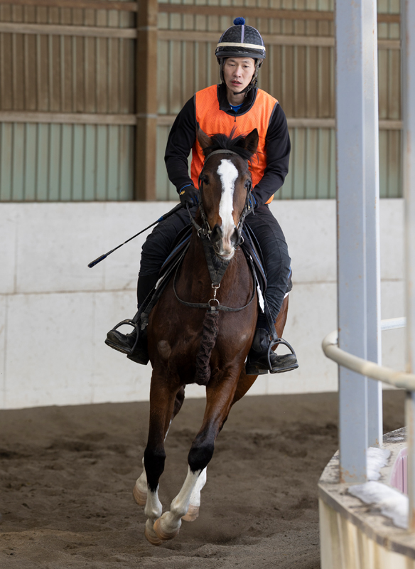 現在は、屋根付きのダートコースでハッキングを2800m、週2回はハロン23秒を上限としたキャンターを3400m乗っています。昨年末に坂路調教を行った際は、周囲の馬にしっかりついていこうとする前向きな気持ちを見せていました。しかし、その後は飼い喰いに影響が出たため、成長途中であることも踏まえて、当面は坂路調教を控える方針です。しばらくはフラットコース主体に基礎体力の強化に努めていきます。