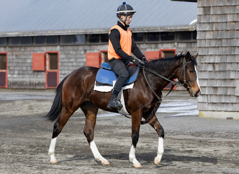 右前の蹄が減り気味で歩様にいくらか影響が出たため、装蹄師と相談し前肢のみ蹄鉄を着けました。そのため、現在は小回りの屋根付きのダートコースを2、3頭で、ゆっくりとしたペースの乗り運動を行っています。右回り、左回りの両方向で周回し、脚慣らしを行っている程度の内容ですが、歩様が気になる点はなくなりました。まだ疲れが完全に抜け切っていない印象があるため、しばらくはごく軽めの運動を続け、早期回復を促していきます。