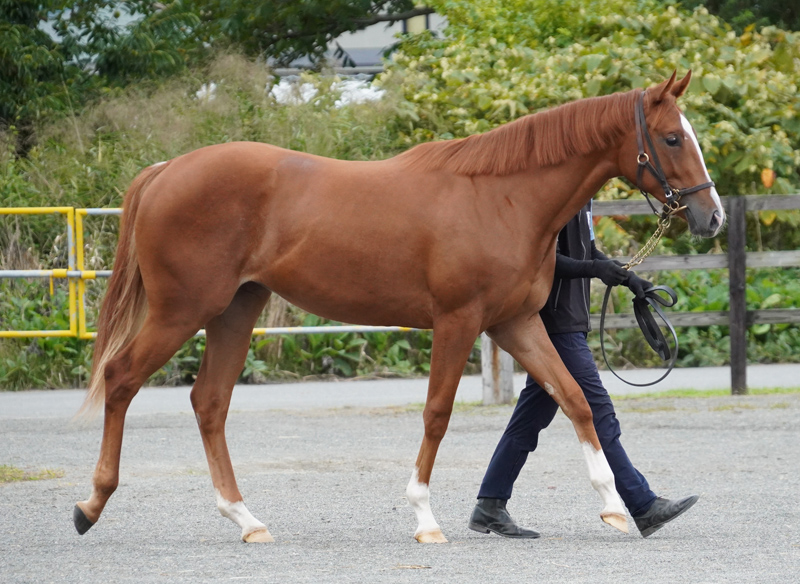米牡馬チャンピオンスプリンターの輸入種牡馬ドレフォンや、米2歳牡馬チャンピオンのアクションディスデイなどを送る活力のある牝系です。母はダートの短距離で3勝。姉ラファドゥラは特別を含む3勝と芝で好成績を上げています。この牝系に三冠馬を配して誕生したのが本馬です。栗毛に流星の容姿は見るからに父の特徴を受け継いでいる印象。コンパクトではありますが、丸みのあるトモや肩周りには程よく筋肉が付き、成長とともにより一層父に似てくるのではないでしょうか。歩かせると非常にバネがあり、キビキビとした動きで後躯から前躯へ連動がスムーズ。俊敏性が感じられ、躍動感に溢れています。気性はピリッとしており、そこも父譲り。大型でスピードとパワーを備えていた母の力も借り、本馬は芝のマイル前後でスピードと瞬発力を発揮してくれそうです。