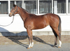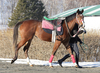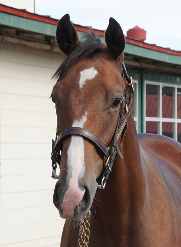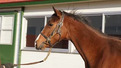 環境の変化に慣らした上で、馴致を行いました。気の強い面はありますが、特に手が掛かるようなことはありません。現在は、屋根付きのダートコースでハッキングを2500m乗っています。一頭だけで乗っていた時は、元気なところを見せていましたが、集団調教を行うと落ち着くようです。後方を走らせる際は、集中力が増し、前向きに走ろうとする気持ちを出してくれます。このまましっかり乗り馴らしていきます。現在の馬体重は430kg。