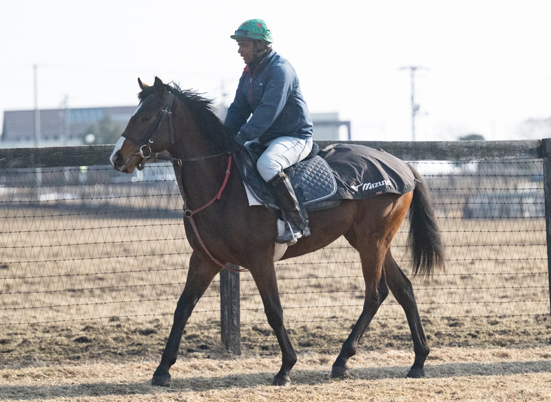 長距離輸送の影響はなく、体調や飼い喰いは良好。環境の変化に戸惑うこともありませんでした。数日間ウォーキングマシーン運動で様子を見てから騎乗調教を開始。少しずつペースを上げ、現在はハロン17秒まで進めてきています。素直で大人しく、走ることに真面目。扱いに苦労するようなことはありません。基本的に併せ馬をしていますが、他馬を気にするようなこともなく、しっかりした脚取りで駆け上がっています。今のところ、体力面の心配もなさそうです。また、馬体重は到着時が418㎏で直近の計測で426㎏。輸送で少し減りましたが、乗りながら増えているというのは良い傾向でしょう。まずは強い負荷に耐えられるような土台づくりを目標に調整していく予定です。「ちょっと小柄かなといった程度。首は少し短めですがバランスが取れていて良い馬ですね。まだ17秒くらいですが、スピードがありそうですよ。これから気が良くなってきそうな印象を受けます。疲労感もないし、現状、体力面でも問題はありません。これから時計を詰めていってどうかですね。しばらくは体をしっかりとつくっていくようなイメージで乗り込んでいきます」(担当者)