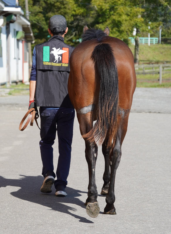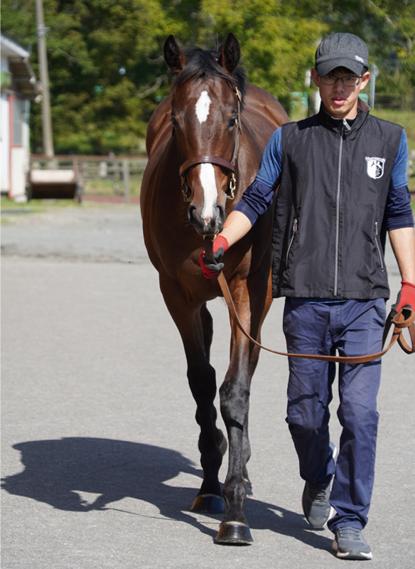 人の指示に対しての反応は素直で、理解力も高いため、馴致を難なくクリアしています。引き続き、昼夜放牧を継続しながら、現在は屋外のダートコースで常歩やダクを乗っています。運動を重ねるにつれて、徐々に少なくはなっていますが、先頭を走らせる際に物見をすることがあるため、中団や後方を走らせている時と同じように、どのポジションを走らせても集中できるように、しっかり乗り馴らしていきます。現在の馬体重は450kg。