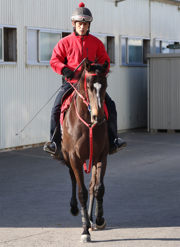 昨年末に2本ほど15-15を入れたあとは回復を促す目的で4日間ほどはウォーキングマシーン運動で調整。1月5日からは騎乗調教を再開しています。基本的なメニューは角馬場で入念に動かしたあと、坂路をハロン16秒くらいで1本。日によって多少強弱をつけています。また、週1回は時計を出しており、ラスト1Fは15秒を切るところまで進めてきています。適度に休みを入れていることもあり、心身ともに疲れは感じられません。獣医師のチェックでも「どこにも治療が必要なところはない。心臓も良くなっている」とのことでした。父の産駒はダートに良績がありますが、素軽いフットワークをしており芝向きの印象。スピードを活かして活躍してくれるのではないでしょうか。ゲート練習も順調で、入り、停止、通過とまったく問題はありません。鞍上の指示に素直に従っていました。今後も無理のない程度に負荷を掛け、心身の更なる良化を促していく予定です。馬体重は433㎏。「時計を入れ始めて一旦は420㎏くらいまで減ったんですが、また増えてきましたね。飼い葉をよく食べてくれるので調整がしやすいですよ。15-15でも楽々上がってきます。捌きがすごく軽いし、バネのある走りをしていますよね。やっぱり良いものを持っていそうですよ。あまり攻め過ぎてソエが出ても良くないので、このあともじっくりと進めていきます」(担当者)