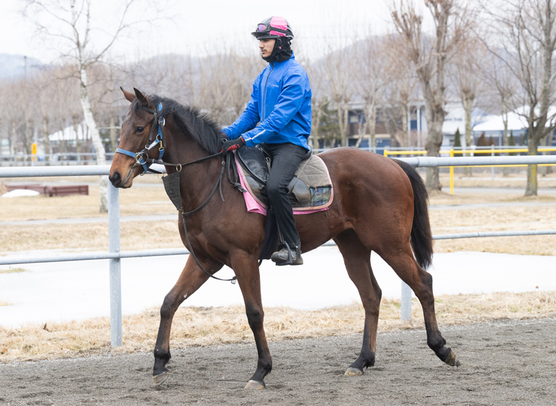 現在は、場内の屋外のウッドチップコースでハッキングを3000m、週1、2回はBTCのウッドチップの屋内坂路でハロン20秒を上限としたキャンターを1000m乗っています。調教を進めるにつれて、自らハミを取るようになり、前向きさがグンと増してきました。フットワークは軽快で、父から受け継いだであろうスピードも感じられます。来月中には、坂路をハロン18秒くらいのペースで乗る予定です。現在の馬体重は410kg。