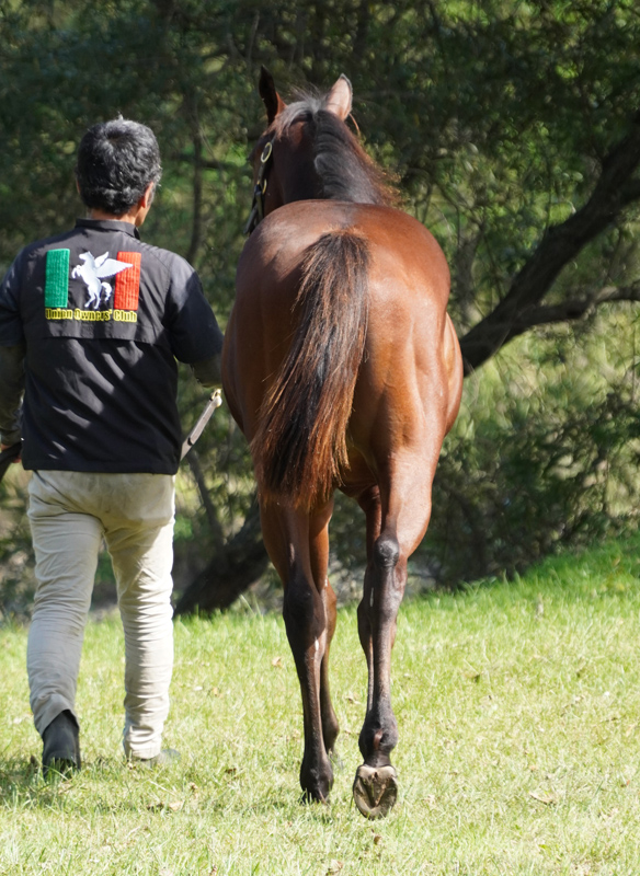 異なる環境に十分に慣れさせ、新しい担当者との信頼関係の構築にじっくり時間を掛けたこともあり、馴致をスムーズに終えることができました。現在は、屋根付きのロンギ場でダクやハッキングを乗っています。左回りと右回りのどちらの周回でも、口向きに癖はありません。騎乗者とのコンタクトもしっかり取れています。このまま基礎事項の習得を徹底することで、早い段階で馬場での調教を開始できるように努めていきます。現在の馬体重は402kg。