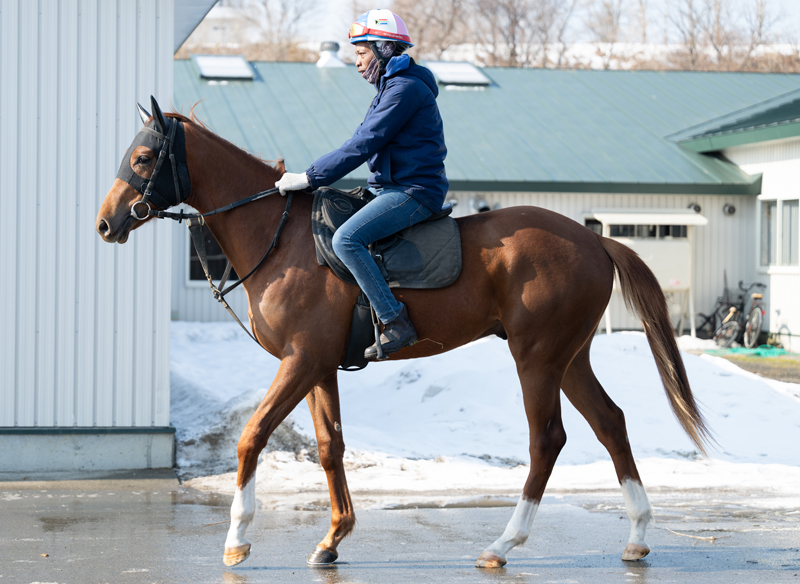 昨年末は、BTCのウッドチップの屋内坂路の終いから15-14を乗りました。ペースアップの指示に戸惑う様子はなく、スピードに乗って最後までしっかり動けていますし、飼い喰いも良好です。その後の10日間ほどはウォーキングマシーン運動を行う程度に留めて一息入れました。現在は、場内の屋根付きのダートコースで軽めキャンターを長めに乗っています。近いうちにBTCでの調教を再開する予定です。