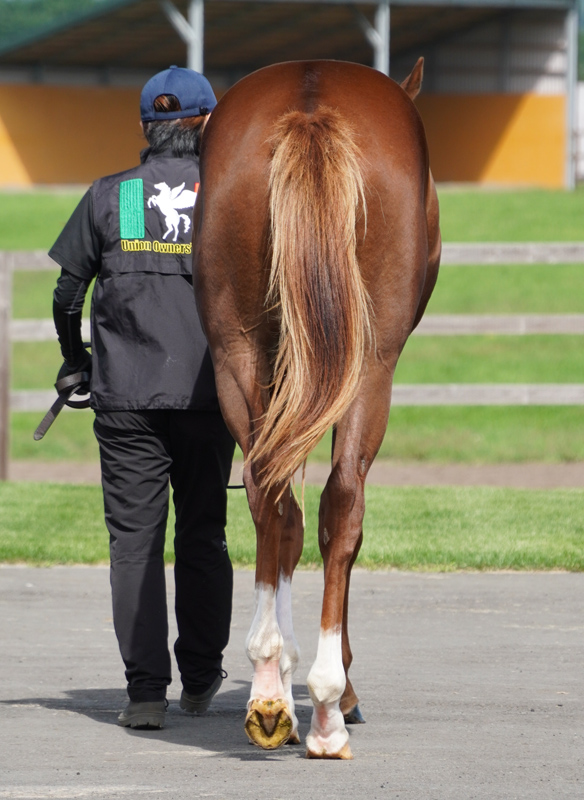 背丈がぐっと伸び、胴も伸びてきたことで、馬体が一回り成長しました。大きくなったフレームには十分な筋肉が付き、牡馬らしい逞しさが感じられます。充実した夏を過ごせたのでしょう。育成場に移動後の、どっしり構えた姿を見ても、心身ともに着実な成長が感じられます。馴致でも特に手が掛からないため、早いうちに乗り馴らしへと移行できそうです。現在の馬体重は440kg。
