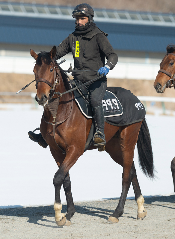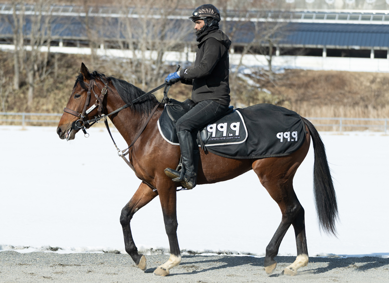 引き続き、BTCの屋内のダートコースをハロン25秒くらいで3000m、週1回はダートコースで2000mの後にウッドチップの屋内坂路でハロン16秒を上限とするキャンターを1000m乗っています。昨年末辺りには15-15を乗れる状態にありましたが、馬体の成長過程を考慮し行いませんでした。最近はフレーム自体に大きな変化はないものの、体つきに余裕が出ているため、現状を確認する意味で終いを強めに乗ることを検討しています。