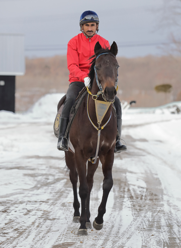現在は、屋内のダートコースでダクを1800m、軽めキャンターを3000m乗っています。年末年始に一息入れる前に、ウッドチップの屋外坂路で終い2ハロンを18-17で乗りました。軽く手綱を譲っただけで加速がつき、勢いよく登り切っています。脚捌きは軽快で、時計以上にスピード感がありました。調教を再開した後も動きはスムーズで、順調に立ち上がっています。今後は、キャンターのペースを少しずつ上げていきます。
