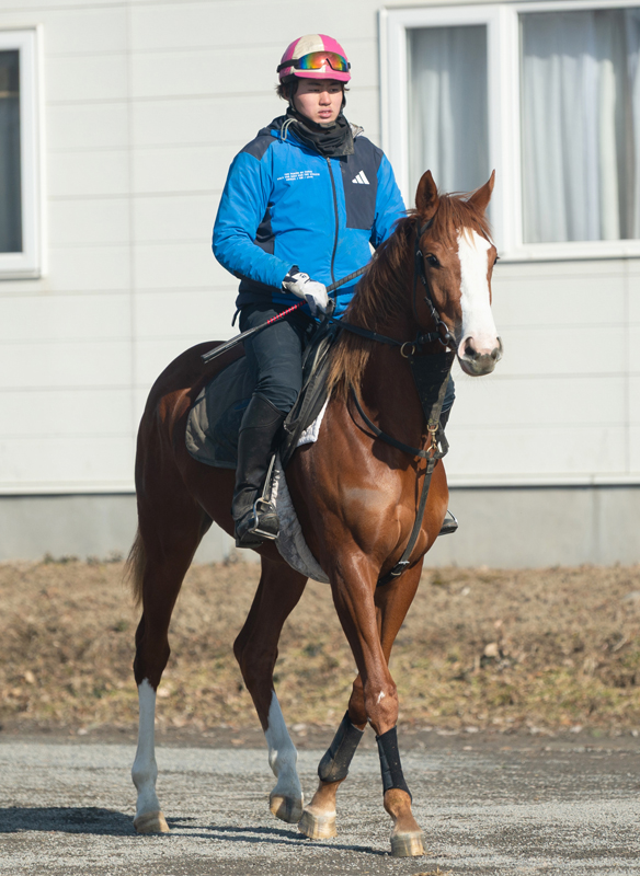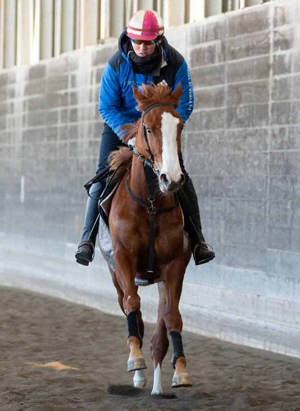 現在は、BTCの屋内の直線ウッドチップコースでハロン20秒を上限としたキャンターを2000m乗っています。もう少し前向きさが出てきてほしいところですが、動きの面では頸を上手く使った走りが徐々にできるようになってきました。跳びも大きくなっており、ブレの少ないフォームで動けるようになっています。坂路調教の開始に向けて、今後もしっかりトレーニングを積み重ねていきます。現在の馬体重は447kg。