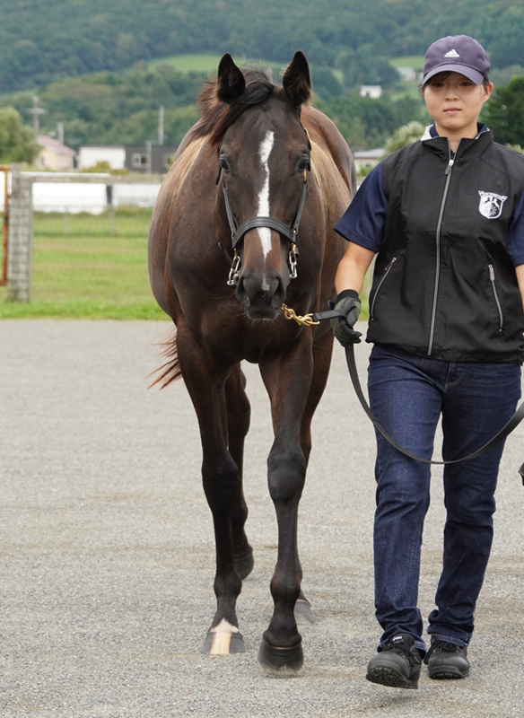 活力のある牝系で、クラブに出したネフェルタリもその弟たちも勝ち上がっており、コンスタントに成績を出してくれていますが、もっと大きなレースを勝てる馬を出したいとの思いから、ディープインパクトの最高傑作と言えるコントレイルを選びました。遅生まれでまだ小柄な印象ですが、動きにはバネを感じ、瞬発力の高さが垣間見えます。芝のマイルから中距離で結果を出し、ゆくゆくは重賞を勝って、牧場に戻って来てもらいたいです。