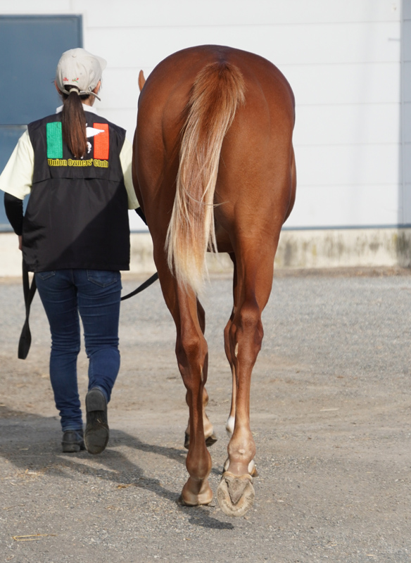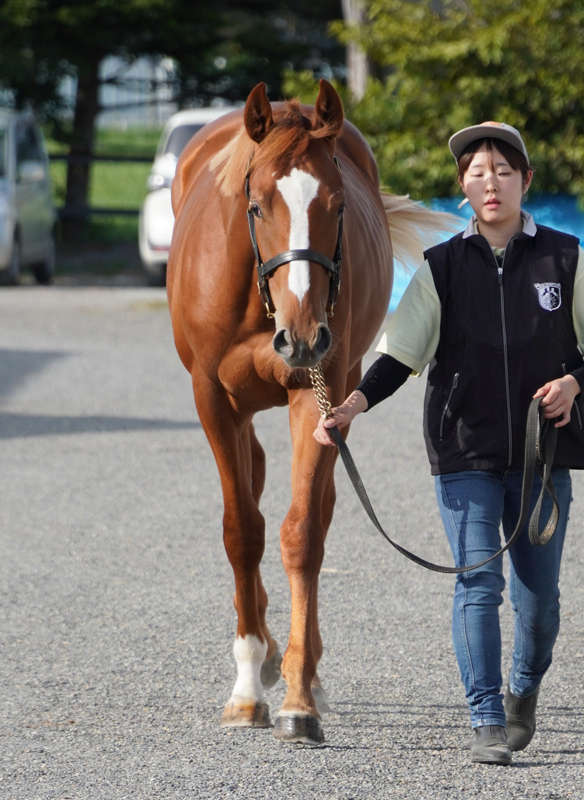 現在は、BTCの様々なコースを使いハロン20秒手前くらいのキャンター調教を行っています。血統面を考慮して慎重に馴致を行いましたが、やや集中力に欠ける面があったくらいで、スムーズに終えました。また、BTCに行った初日には緊張からか体を硬くした面もありましたが、すぐに慣れ現在は気になりません。調教時に変に力むことがないように注意しながら、折り合いや口向きの向上に重点を置いて、調整するように心掛けていきます。現在の馬体重は481kg。