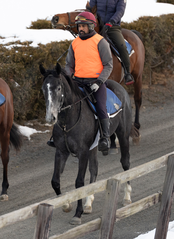 現在は、屋根付きのダートコースでハッキングを3400m、週2回はダートの屋根付き坂路でハロン17秒くらいのキャンターを800m乗っています。昨年末に終いを強めに乗った後も、疲れは見られなかったため、徐々に坂路調教のペースを上げています。しかし、頭を高く上げ後駆を踏み込む動きができていません。このまま体力作りに努めながら、体を大きく使ったフォームで走れるように教えていきます。
