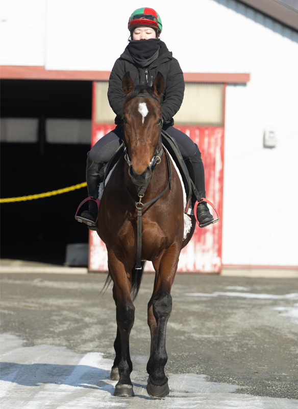 左後肢の腫れはすっかり引き、歩様にも問題の再発はありません。そのため、この中間から乗り運動を再開しました。現在は、BTCの屋内のダートコースをハロン23秒くらいのペースで1800m、週1回はウッドチップの屋内坂路でハロン20秒を上限としたキャンターを1000m乗っています。患部を気にする素振りはなく、脚捌きもスムーズです。念のため、運動後に水冷等のケアを継続して調教を進めていきます。現在の馬体重は547kg。