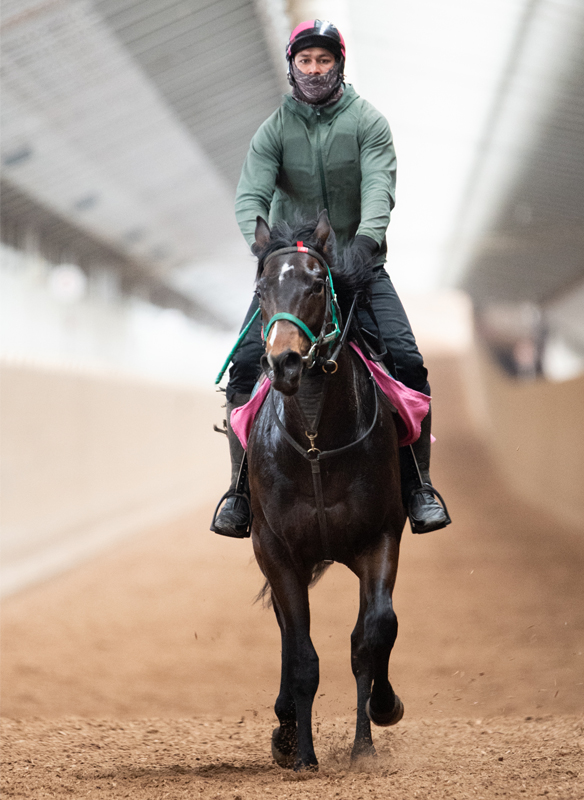 現在は、場内の屋外のウッドチップコースでハッキングを3000m、週1、2回はBTCのウッドチップの屋内坂路でハロン18秒を上限としたキャンターを1000m乗っています。段階的にキャンターのペースを上げても、ラストまで馬なりで駆け上がれています。また、運動後の息が整うまでにあまり時間は掛かっていません。スタミナ的に運動の負荷を上げても十分対応できそうなため、更に坂路の時計を詰めることを検討しています。