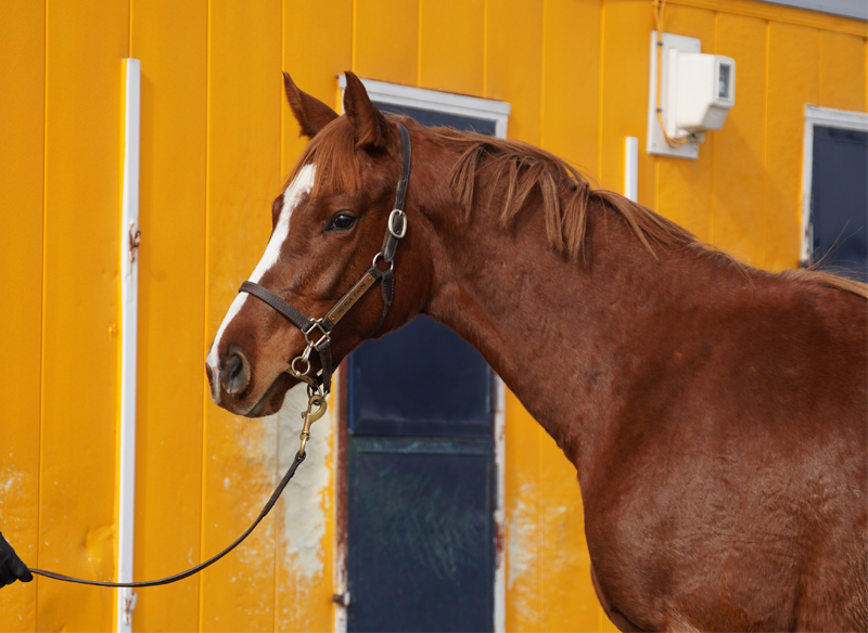 現在は、屋外のダートコースで23秒を上限としたキャンターを2400m乗っています。最近は人が跨るとピリッとした面を見せ、前向きさもグッと増してきました。その中でも騎乗者とのコンタクトは変わらずしっかり取れています。また、乗り運動を終えた後はとても大人しく、気持ちの切り替えが自然と身についてきたようです。今後は段階的に運動の負荷を上げていき、更なる体力の強化に努めていきます。現在の馬体重は414kg。