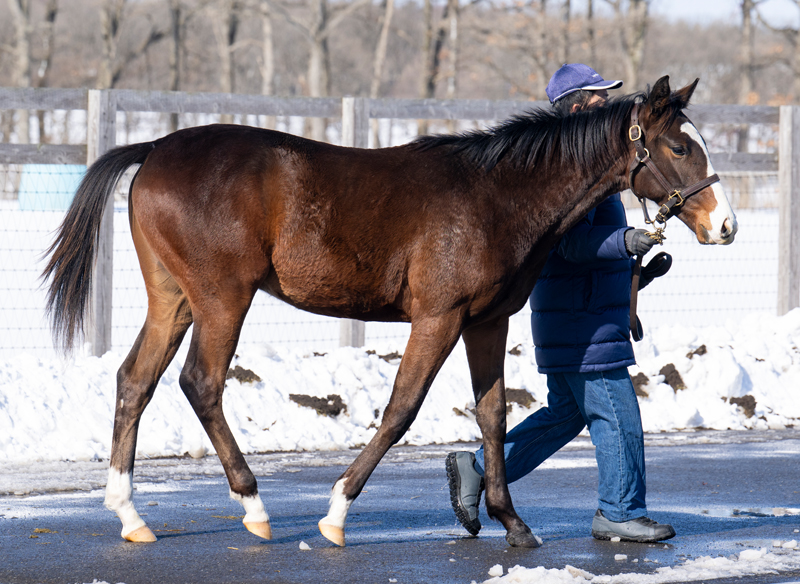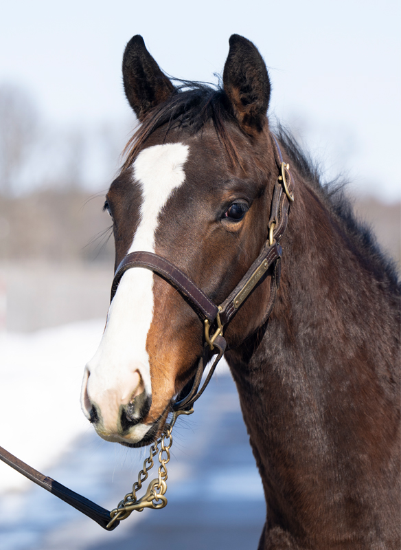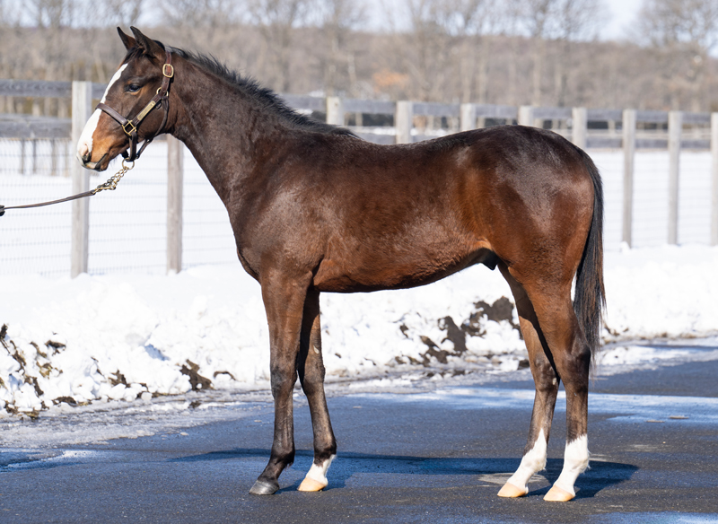 セレクトセール2025購入馬です。父は圧巻のレース内容で他馬を圧倒しGⅠ6連勝、ワールドベストホースにも選ばれたイクイノックス。本馬は多大な期待を背負い種牡馬入りした父の初年度産駒。母は牝馬交流重賞などオープン馬として活躍しました。ジャパンCを制したスワーヴリチャードを筆頭に、多くの活躍馬が名を連ねる筋の通ったファミリーです。スラリとした四肢、軽さを感じさせるシルエット、額の流星など父を彷彿とさせます。預託予定の長谷川浩大調教師は「セリの後に牧場に見に行きましたが、背が伸びてひと回り大きくなり、変わってきているイメージを持ちました。品があってバランスの良い馬体。賢そうな顔も良いですね。何よりイクイノックスの産駒を預けて頂けるのは光栄です。母系も走っていて血統的にも楽しみ。良い結果が出せるように頑張ります」と意気込みは十分。母はダートで活躍も初勝利は芝。やはり父と同じ芝の中距離あたりが活躍の舞台となるでしょう。偉大な父に恥じない活躍を期待しています。